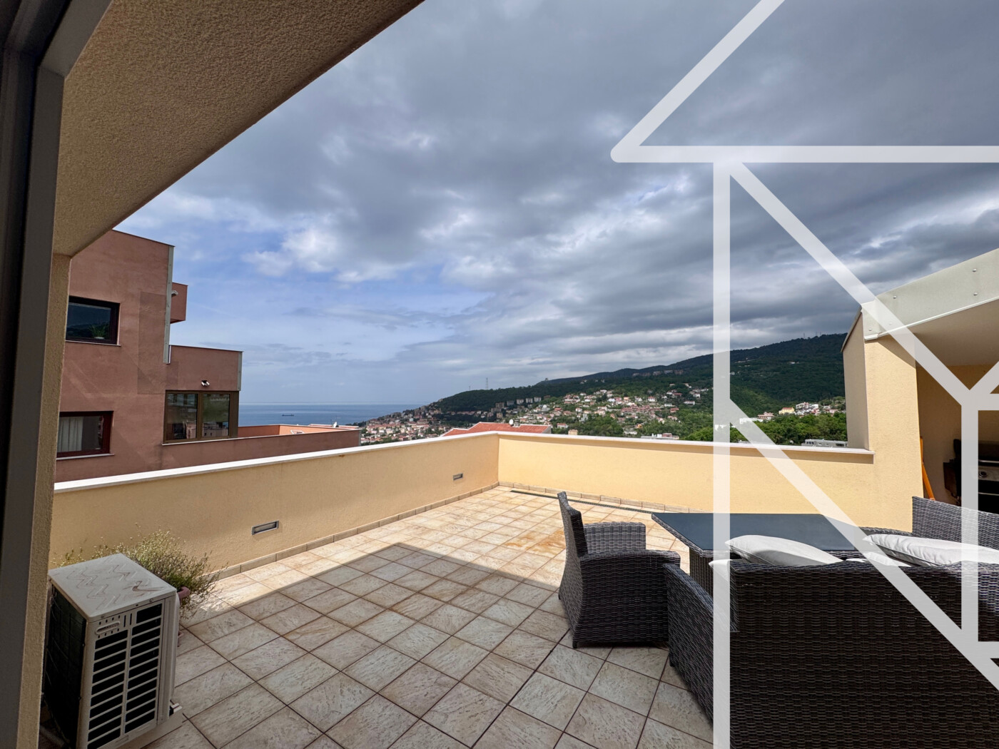 In via Ovidio, una delle zone più tranquille e panoramiche di Trieste, proponiamo in vendita un appartamento di 105 mq situato al quarto piano di un elegante stabile dotato di ascensore e completamente privo di barriere architettoniche. La vera perla di questa proprietà è la splendida terrazza di 54 mq, che regala una vista totalmente aperta sul mare e sulla città, un angolo esclusivo dove rilassarsi o godersi pranzi e cene all’aperto in totale privacy. La zona giorno è composta da un salone ampio e luminosissimo, grazie a una grande porta finestra che conduce direttamente alla terrazza. La cucina, funzionale e ben organizzata, si integra perfettamente con l’atmosfera accogliente della casa. La zona notte comprende una spaziosa camera matrimoniale, cabina armadio e bagno padronale dotato di vasca idromassaggio, oltre a due camere singole e un secondo bagno con doccia. L’appartamento è dotato di infissi nuovi in PVC a taglio termico e acustico, impianto di aria condizionata a 3 split di recente installazione, impianto d’allarme e cassaforte, per garantire il massimo del comfort, della sicurezza e dell’efficienza energetica. Lo stabile ha recentemente beneficiato degli interventi del Superbonus 110%, con rifacimento completo delle facciate, cappotto termico, caldaia a condensazione di ultima generazione e installazione di pannelli fotovoltaici, garantendo così efficienza e risparmio nei consumi. Completano la proprietà una cantina di grandi dimensioni, ben suddivisa da steccati, e un comodo posto auto condominiale. Un’opportunità unica per chi cerca una casa pronta da vivere, con spazi generosi, finiture curate e una vista che lascia senza fiato.