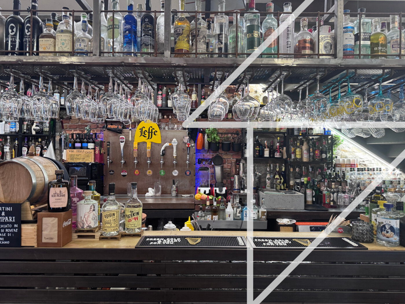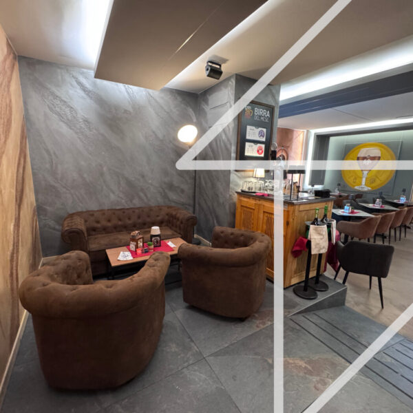 Il grande banco bar, dotato di sedie alte per il servizio diretto al banco, è suddiviso in zona caffetteria e area cocktail, entrambe attrezzate con impianti e strumentazioni professionali. All’interno è presente una grandissima bottiglieria, capace di ospitare fino a 1000 bottiglie, elemento distintivo che impreziosisce l’offerta del locale. La sala interna, separata rispetto al dehor, ospita comodamente dieci tavoli in un ambiente raccolto e funzionale.
